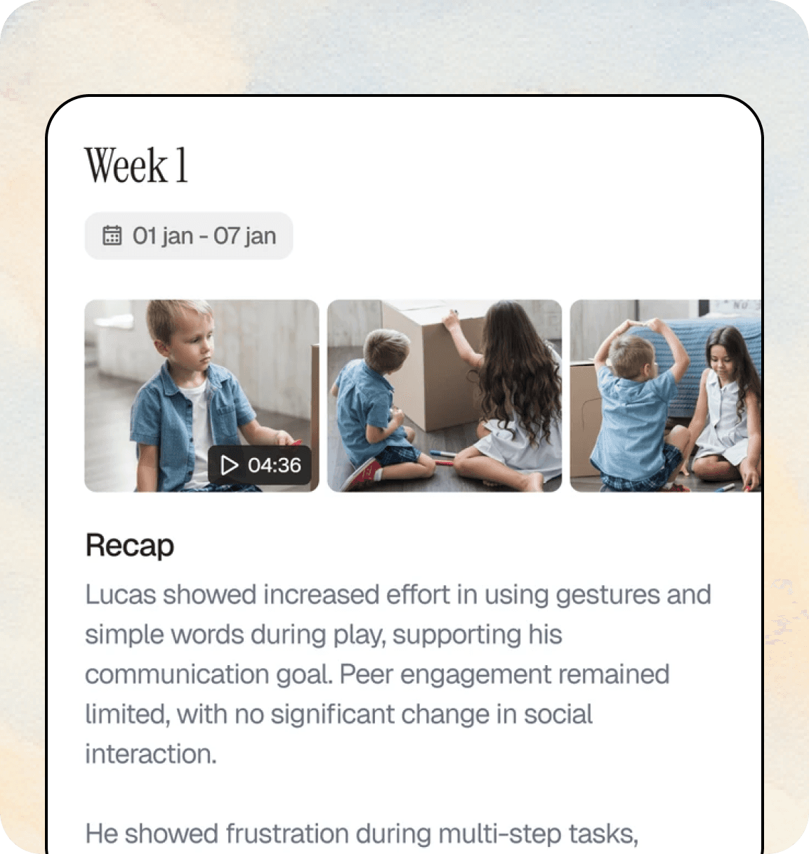 You stay actively involved while your child’s therapists work together as a team. Goals, updates, photos, and videos are shared in one secure place, so everyone stays aligned and therapy becomes more effective, helping your child make more meaningful progress over time.