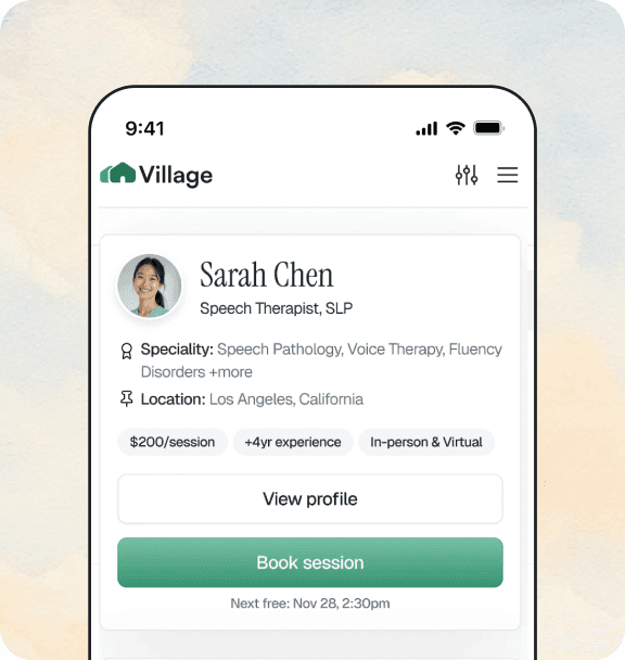 Tell us about your child’s needs, your insurance, location, and preferences, and a Village care navigator will provide you with a curated list of therapists who are the best fit. Or you can browse our network of providers directly any time.