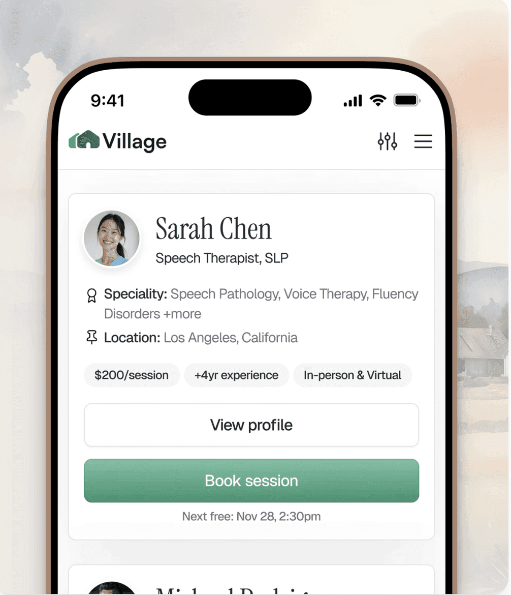 Skip the endless searching — Village gives you access to a diverse network of experienced, vetted therapists and specialists. Our data-driven platform makes it easy to find providers who match your needs, schedule, and preferred setting — whether it’s in-home, at school, virtual, or in the clinic.